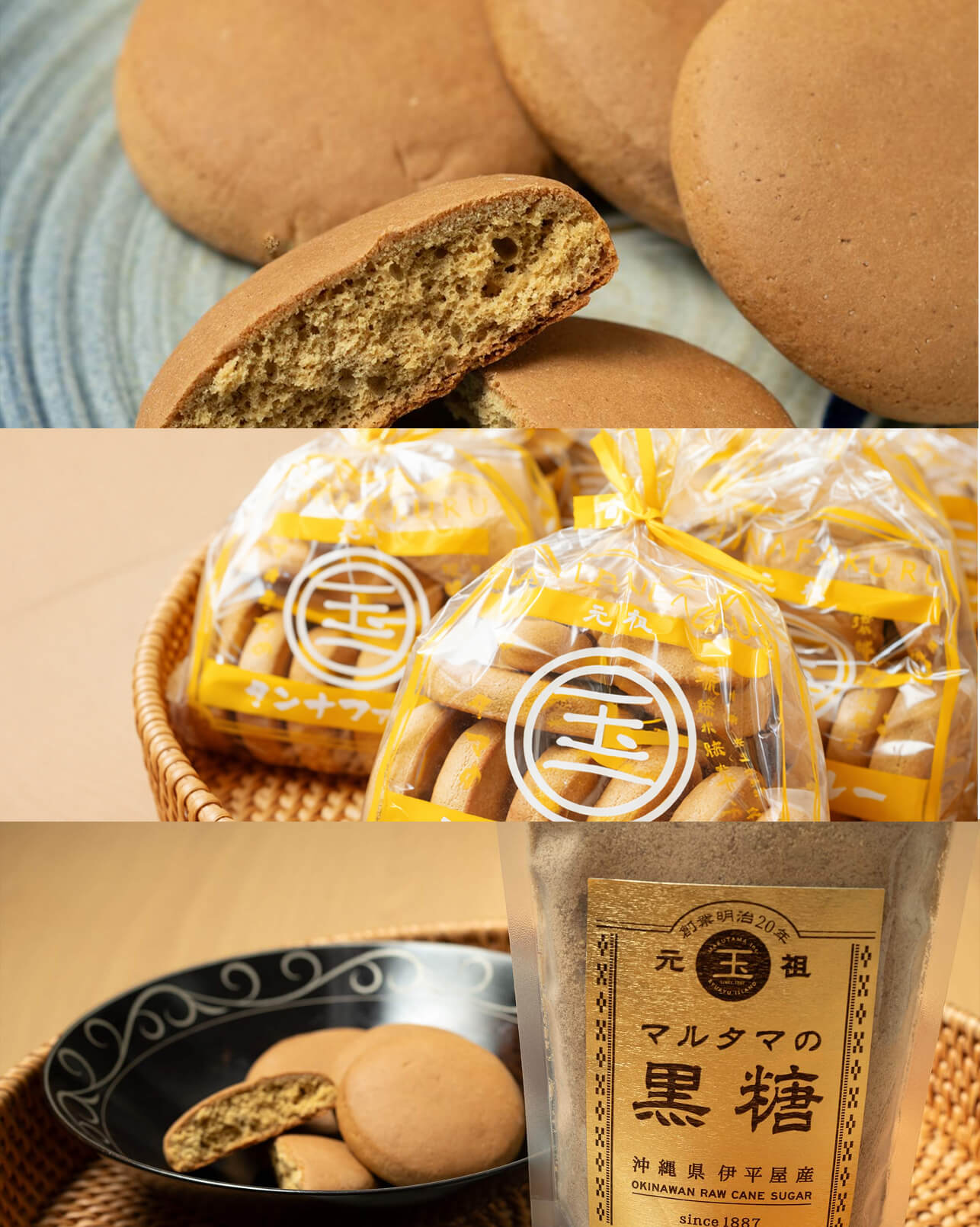 タンナファクルーは明治二十年、首里真和志町で生まれました。私の曽祖父であり丸玉創業者の玉那覇宏次朗の父が考案した、黒糖、 小麦粉、卵で作った素朴な焼き菓子です。当時は大変高価な宮廷菓子、光餅(クンペン)の代用品として庶民に 親しまれ、今では沖縄の伝統的な焼き菓子として知られております。この一風変わったタンナファクルーという名前は創設者のあだなに 由来しています。家の名である「玉那覇」(沖縄の方言でタンナファ)と色黒だった曽祖父のあだ名「色黒」(クルー)を合わせて「タンナファクルー」と呼ばれるようになったそう。長く庶民に愛されてきたタンナファクルー。私も丸玉の三代目として、創業当初から続く、お客さまへの感謝の気持ちと伝統、技法を守り、これからも変わらない美味しさを届けてまいります。
